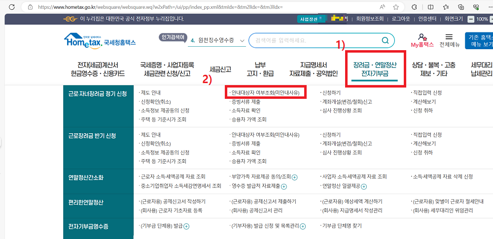 ※미안내사유확인방법(국세청홈택스 로그인 1)상단 장려금 메뉴 클릭 2)안내대상자여부조회(미안내사유) 클릭합니다.