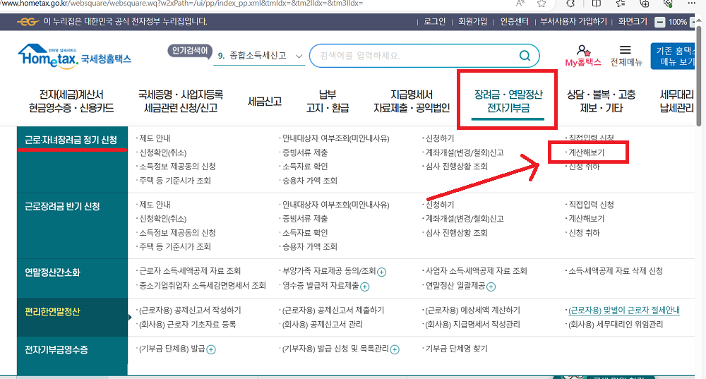 홈택스 로그인 → 장려금ㆍ연말정산ㆍ전자기부금 → 근로ㆍ자녀장려금 정기신청 → 신청하기