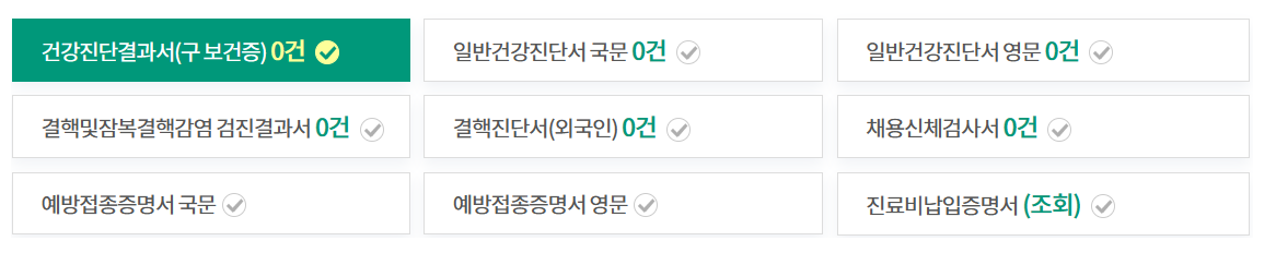 공공보건포털(e-보건소)은 공공보건의료기관(보건소, 의료원 등)의 내역만 조회가 가능합니다. 사설의료기관에서 건강진단검사를 받으셨다면 당연히 발급이 불가합니다. 또한 건강진단결과서(구 보건증)의 온라인 발급은 판정결과가 '정상'인 경우만 조회 가능합니다.