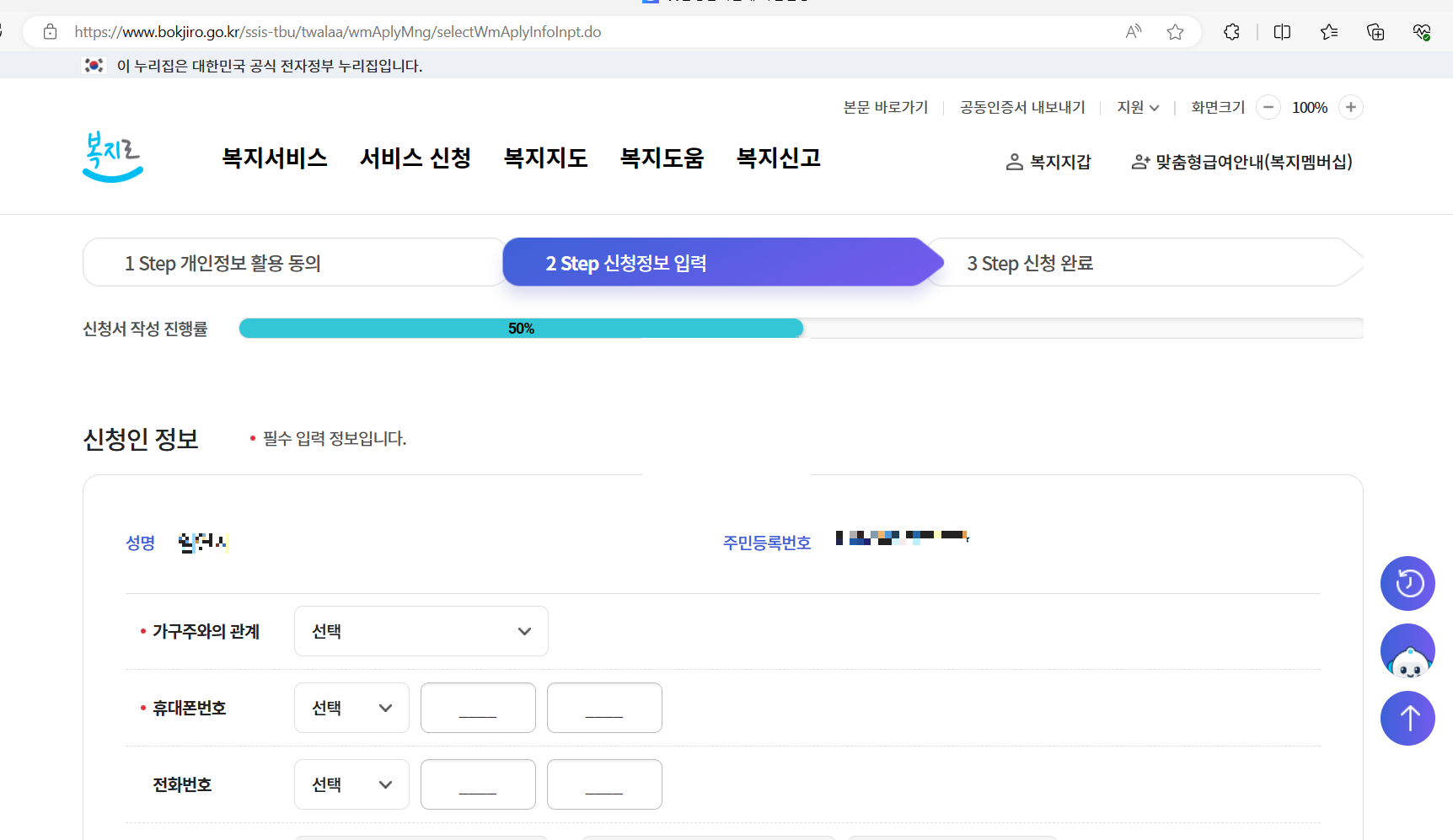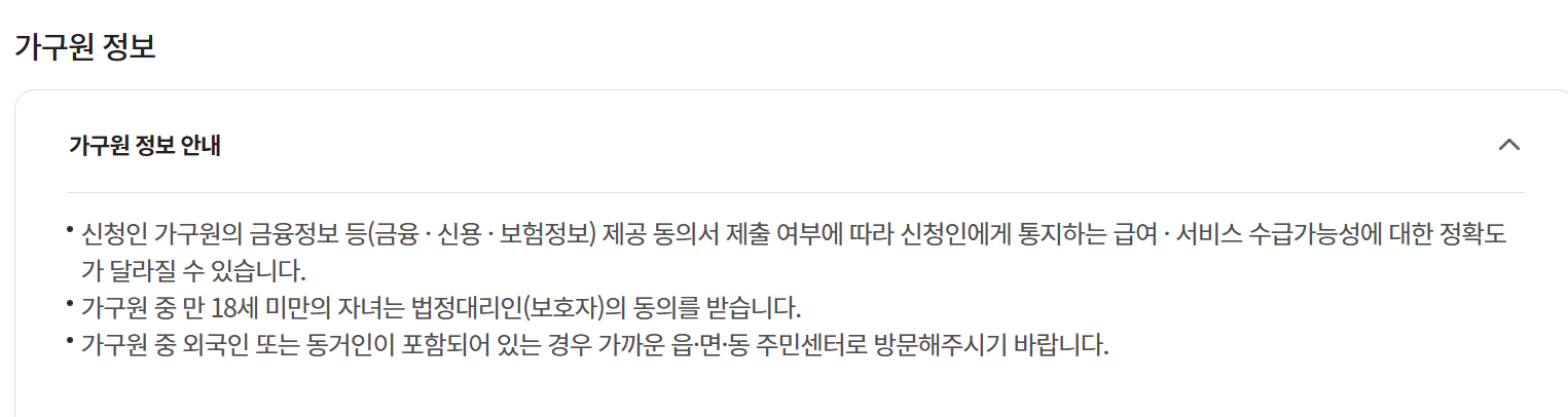 5) 가구원 정보도 입력해줍니다. 신청인 가구원의 금융정보 등 제공 동의서 제출여부에 따라 신청인에게 통지하는 급여 및 서비스 수급가능성에 대한 정확도가 달라질 수 있다 라는 안내에 따라 저는 금융정보제공 동의에 모두 체크해 주었습니다. 세대주가 아니더라도 가구주와의 관계만 입력해주면 신청은 가능합니다.