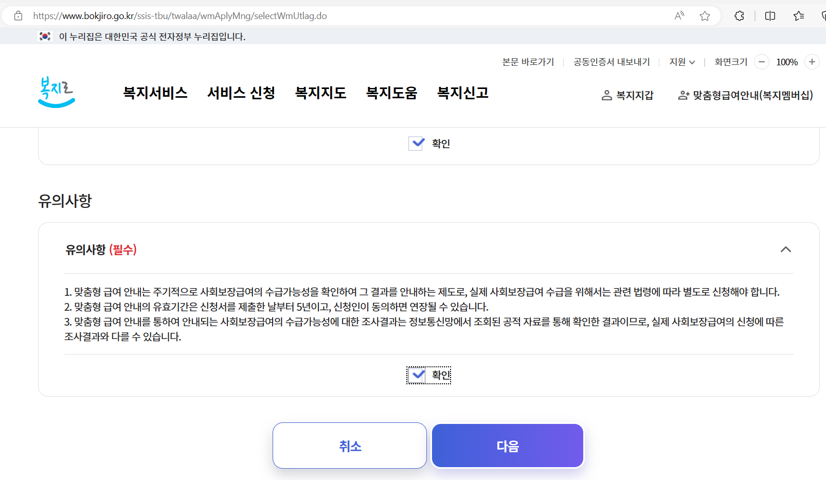 3) 맞춤형 급여안내의 유효기간은 신청서를 제출한 날로부터 5년이내입니다. 맞춤형 급여를 통하여 안내되는 사회보장급여의 수급가능성에 대한 조사결과는 정보통신망에서 공적자료를 통해 확인한 결과이므로, 실제 사회보장급여의 신청에 따른 조사결과와 다를 수 있다는 안내가 나옵니다. 안내를 확인하셨다면 아래 '다음' 버튼을 눌러줍니다.