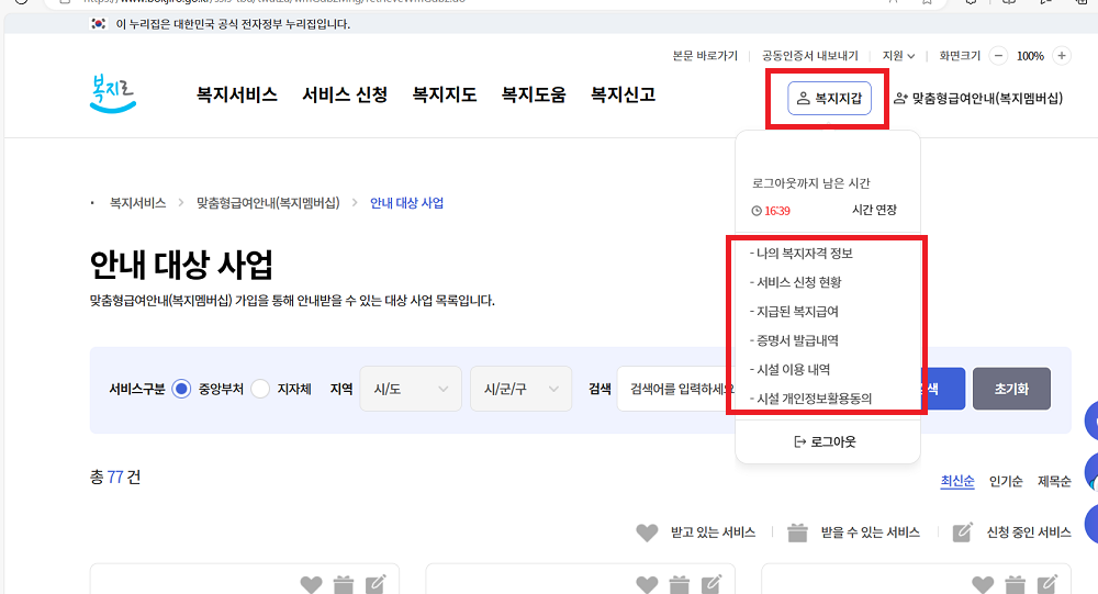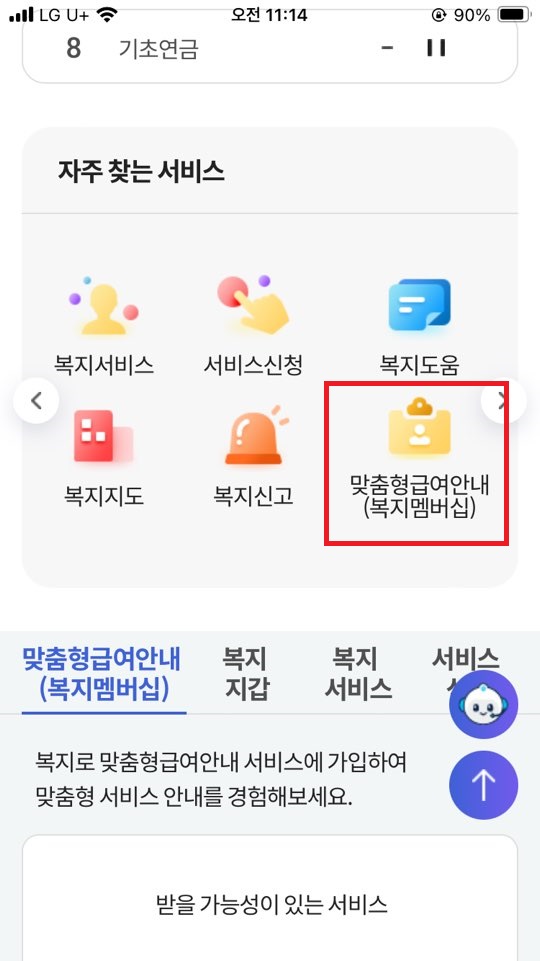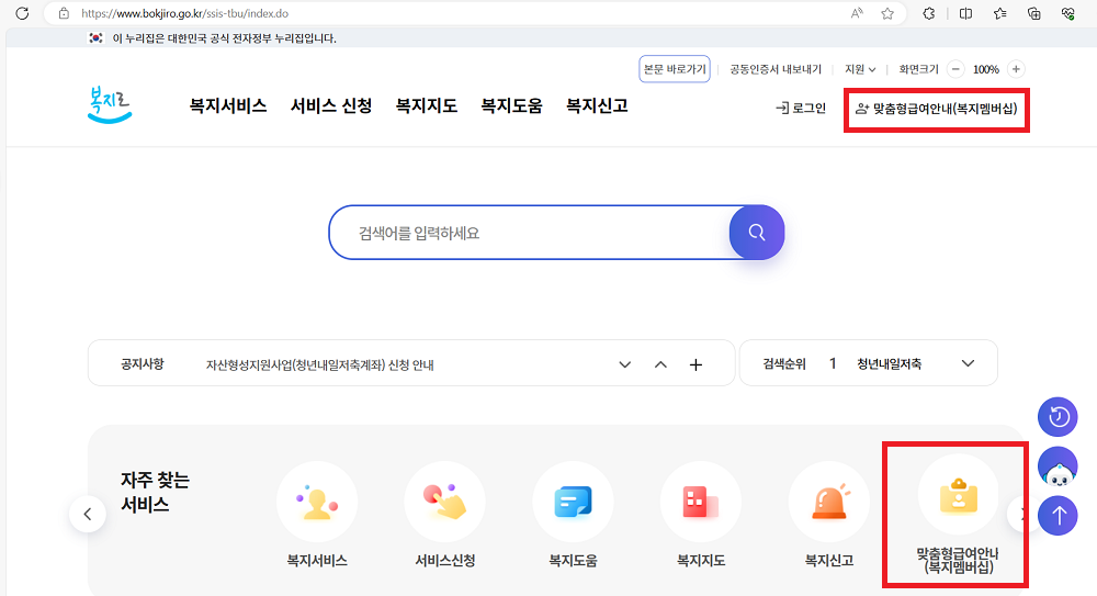 1) 복지로 홈페이지에 접속해서 로그인을 진행해 주신 후 , 우측 상단 '맞춤형 급여안내(복지멤버십)' 을 클릭하거나 중간 자주찾는 서비스에서 '맞춤형 급여안내' (복지멤버십) 클릭해줍니다.