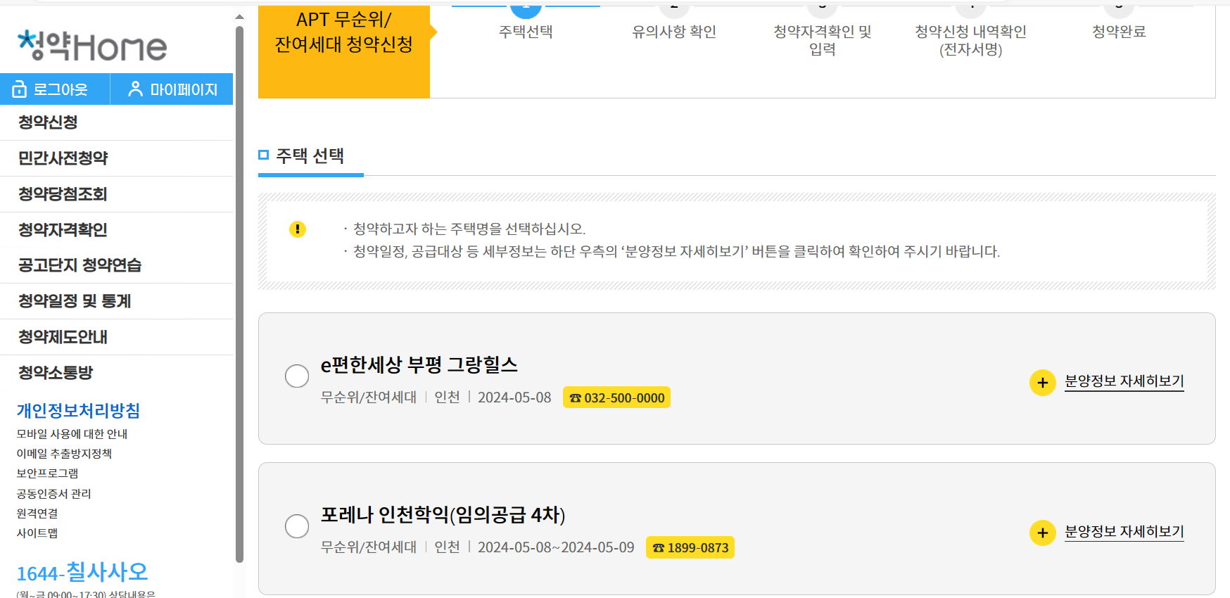 STEP 4. 청약할 단지 리스트 확인 후 신청을 원하는 아파트를 선택합니다. 신청일 기준으로 청약 신청이 가능한 주택만 목록에 표시됩니다.