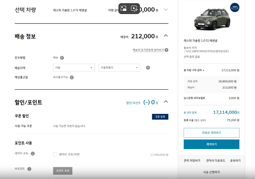 1-3. 견적을 확인합니다. 배송정보를 입력하고 할인 쿠폰과 포인트 혜택도 꼼꼼히 챙깁니다. 현대 M포인트 블루멤버스 포인트 사용이 가능합니다. 견적을 모두 확인했다면 계약하기 버튼을 눌러 다음 단계로 진행합니다.
