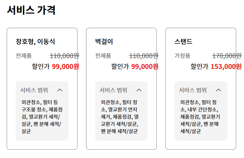 이상 공식업체를 통한 에어컨 청소가격과 할인혜택에 대해 알아보았습니다. 다양한 사설업체를 이용하는 방법도 있습니다만, 일일이 살펴보고 선정해야 하므로 시간이 걸릴 수가 있고, 업체를 잘못 선정하게 되면 기술력 부족, 저가 세척액을 사용한 세척 등으로 피해가 발생할 수 있으니 공식업체를 통해 미리미리 에어컨 청소하시고 상쾌한 여름 맞이하세요.