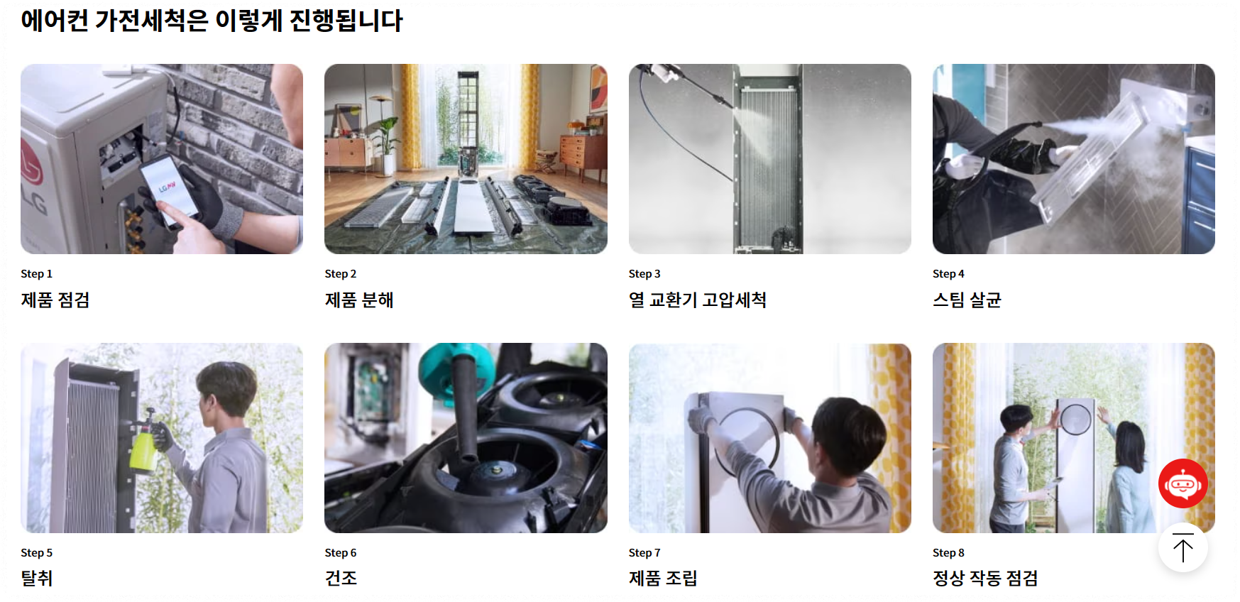 세척 서비스 매니저가 방문하여 제품에 이상이 없는지 확인하고 맞춤형 서비스를 제공하며, 전문 클리닝 장비와 세정제품으로 눈에 보이지 않는 곳까지 위생적으로 관리한다는 장점이 있습니다.